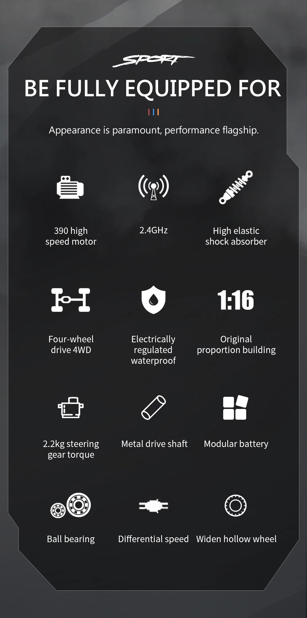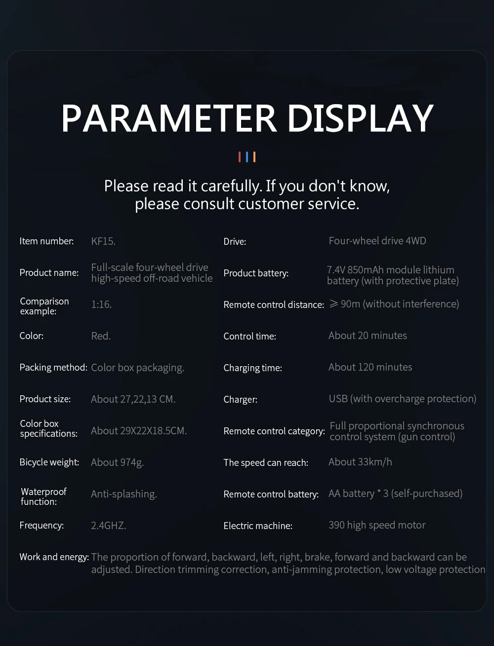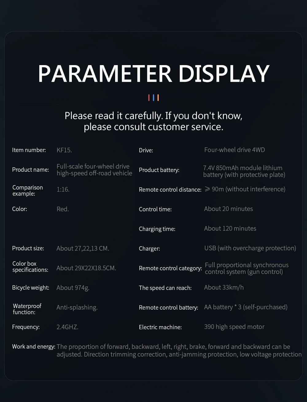 Product description: 1:16 full scale four-wheel drive high-speed off-road vehicle