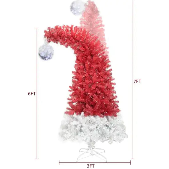 Specification Dimensions: 72 in * 36 in * 36 in Weight: 12.54 lb Available Ship to: United States Main Color: Red Main Material: PVC Details Product Features: If you love Santa so much, why not bring the whole look to the tree? Be bold with this Christmas Hat-inspired Artificial Tree. A red and white Christmas Hat in the shape of a Christmas Tree has 1250 bendable branches and 300 LED lights that can house any ornaments and even make your Christmas Hat tree unique. All branches and tips are made of premium PVC, the material of this artificial fir is fire-resistant, allowing you to decorate home safely and durably. Standing tall and adorned with vibrant, holiday-themed decorations, our Santa Hat Tree is the perfect centerpiece for any Christmas gathering. The rich red and white color scheme, complete with fluffy faux fur trim and sparkling ornaments, captures the essence of holiday cheer and adds a touch of fun to your home. Easy to assemble and designed to bring joy to every corner of your space, this unique tree is not just a decoration—it's a conversation starter and a symbol of festive spirit. Whether placed in your living room, entryway, or office, the Santa Hat Tree will spread smiles and create lasting memories. Description: 6FT Hinged Fraser Fir Artificial Fir Bent Top Christmas Tree If you love Santa so much, why not bring the whole look to the tree? Be bold with this Christmas Hat-inspired Artificial Tree. A red and white Christmas Hat in the shape of a Christmas Tree has 1250 bendable branches and 300 LED lights that can house any ornaments and even make your Christmas Hat tree unique. All branches and tips are made of premium PVC, the material of this artificial fir is fire-resistant, allowing you to decorate home safely and durably. While the tree trunk and stand are made of sturdy metal. It can hold most garland, gifts and all your favorite ornaments for a customized look. Specification Bulb Type LED Light Tone Cold Light Light Color Clear White Light Functions Combination/In wave/Sequential/Slo glo/Chasing/Flash/Slow fade/Twinkle/Flash/Steady on Power Source Electric Plug-In Light Count 300 Stay-Lit Bulbs Yes Branch Tip Count 1250 Number of Assembly Sections 4 Tip Material PVC (polyvinyl chloride) Branch Construction Hinged Tree Durability UV Resistant Needle Color Red/White Stand Included YES Stand Material Metal Location Indoor Use Only Selected for you