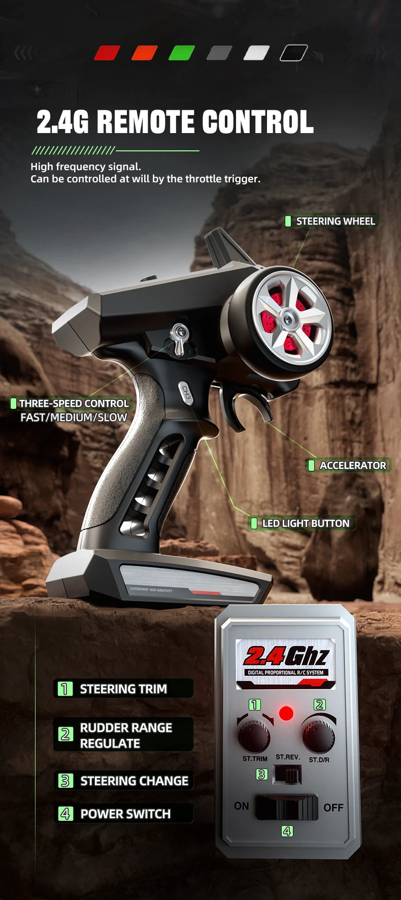 4, 2.4G full scale synchronized remote control system . Full ratio throttle/steering;